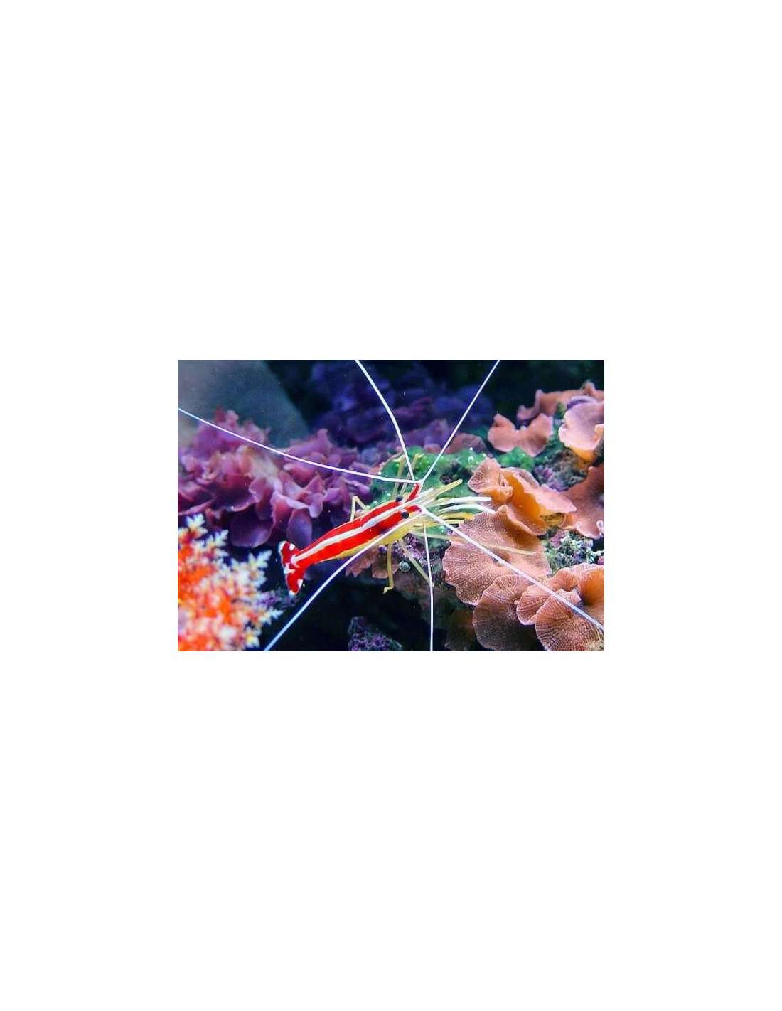 Scarlet Skunk Cleaner Shrimp también se conoce como Red Skunk Cleaner Shrimp debido al distintivo par de rayas rojas brillantes que delinean la única franja blanca que corre por su espalda. El camarón Scarlet Skunk Cleaner a menudo se encuentra en grupos entre rocas vivas o corales. En el acuario doméstico, el camarón limpiador Scarlet Skunk requiere un hábitat similar y compañeros de tanque pacíficos. Algunos peces, como Hawkfish y Lionfish o camarones o cangrejos depredadores pueden ver a este miembro de la familia Hippolytidae como alimento.