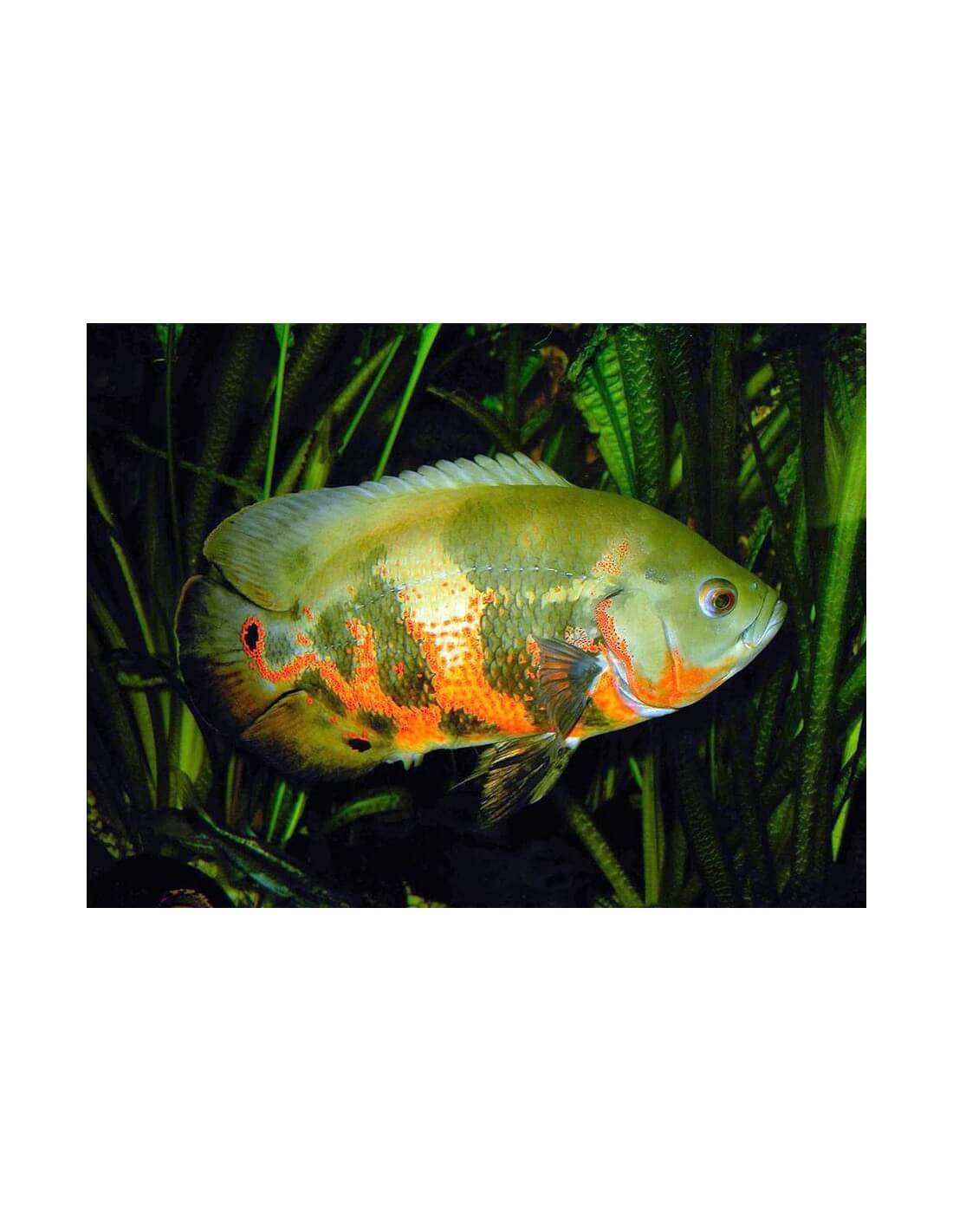 En estado natural, el pez óscar suele ser oscuro, con manchas anilladas de color naranja en el pedúnculo caudal y aleta dorsal.