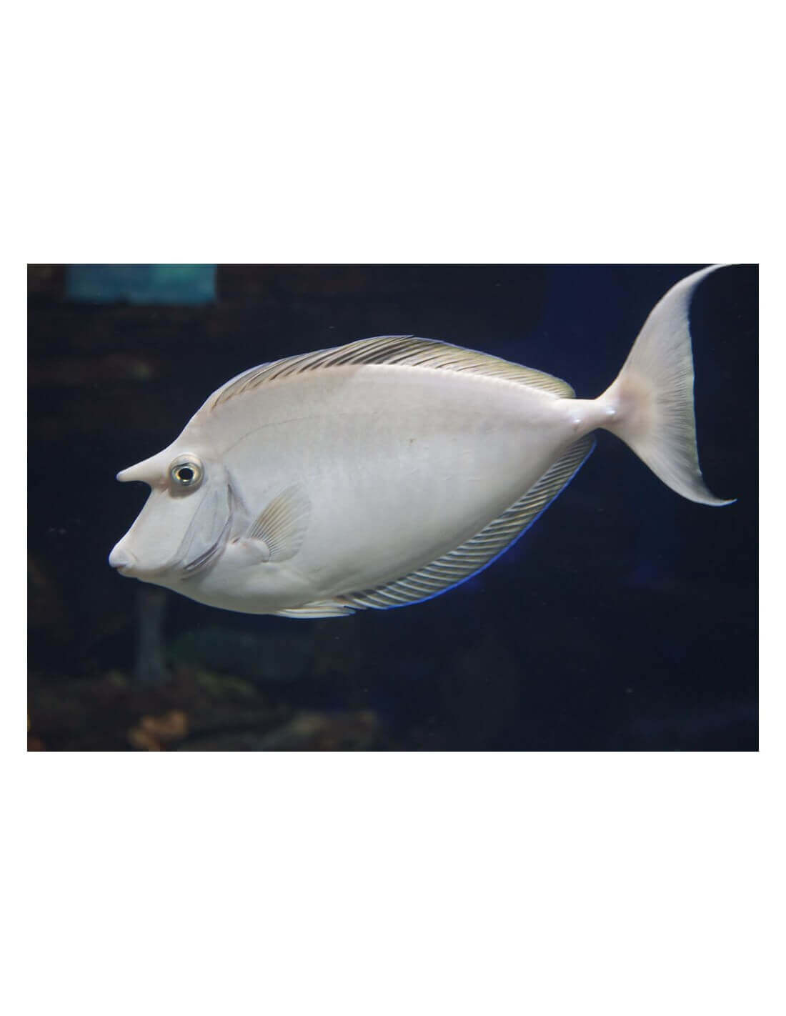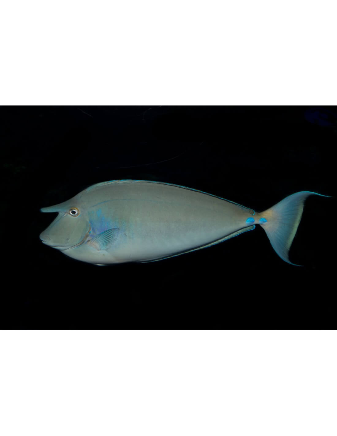 El cuerno del Bluespine Unicorn Tang se desarrolla cuando el pez alcanza un tamaño de aproximadamente 15 cm. Se encuentra muy atrás en la cabeza y no se extiende más allá de la punta del hocico. Tiene espinas de pedúnculo grandes y permanentemente erectas que pueden enredarse fácilmente en una red o causar lesiones al manipulador. Un acuario de 1000 lts o más es necesario para proporcionar un montón de espacio y lugares para esconderse. Es agresivo con su propia especie, pero pacífico con otros peces. Aunque comerá alimentos proteicos junto con otros peces en el acuario, es importante que se les ofrezcan muchas algas marinas. Esto fortalecerá su sistema inmunológico, reducirá la agresión y mejorará su salud general. Ofrezca algas nori atadas a una roca o use un clip y alimente al menos 3 veces por semana.