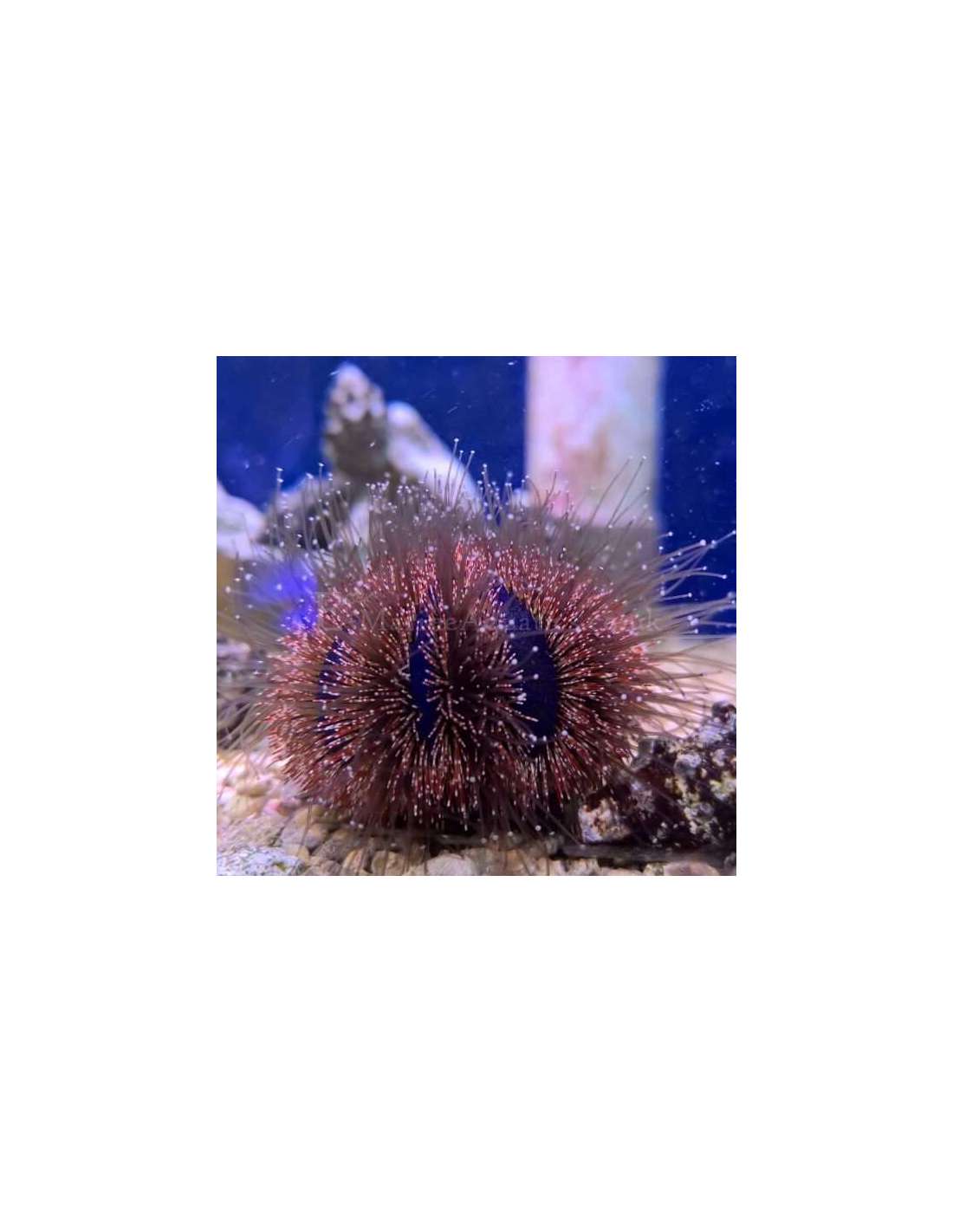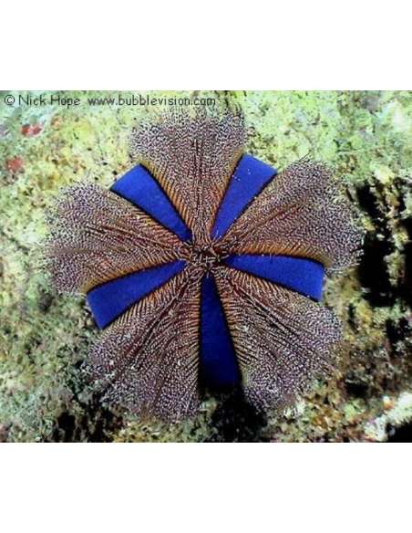 Procedente del Indo-Pacífico este erizo vegetariano se diferencia del resto de erizos por el color azul de su cuerpo provisto de filas rectas de espinas cortas grises o plata. Suele tener en su superficie detritus, conchas y fragmentos de alga a forma de camuflaje frente a depredadores. Pueden llegar a veces hasta los 5 cm de diámetro.