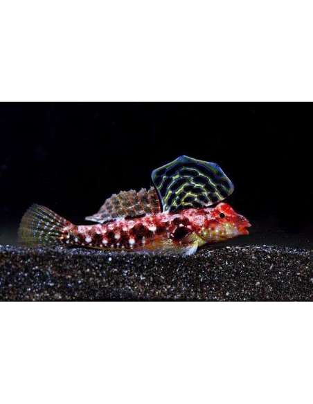 El Ruby Red Dragonet también se conoce como Flame Dragonet o Stellate Dragonet. Su cuerpo es un moteado de rojo y blanco con grandes manchas oscuras. El macho generalmente tiene colores más brillantes y una aleta dorsal más grande.