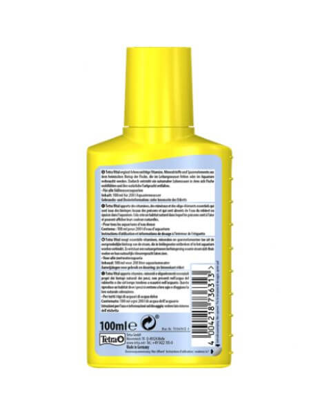 Tetra Vital aporta vitaminas, minerales y oligoelementos esenciales procedentes del habita natural de los peces, que el agua del grifo no contiene o que con el tiempo se agotan en el acuario. De este modo se crea un entorno casi natural, en el que los peces se sienten bien y desarrollan su colorido natural con facilidad.